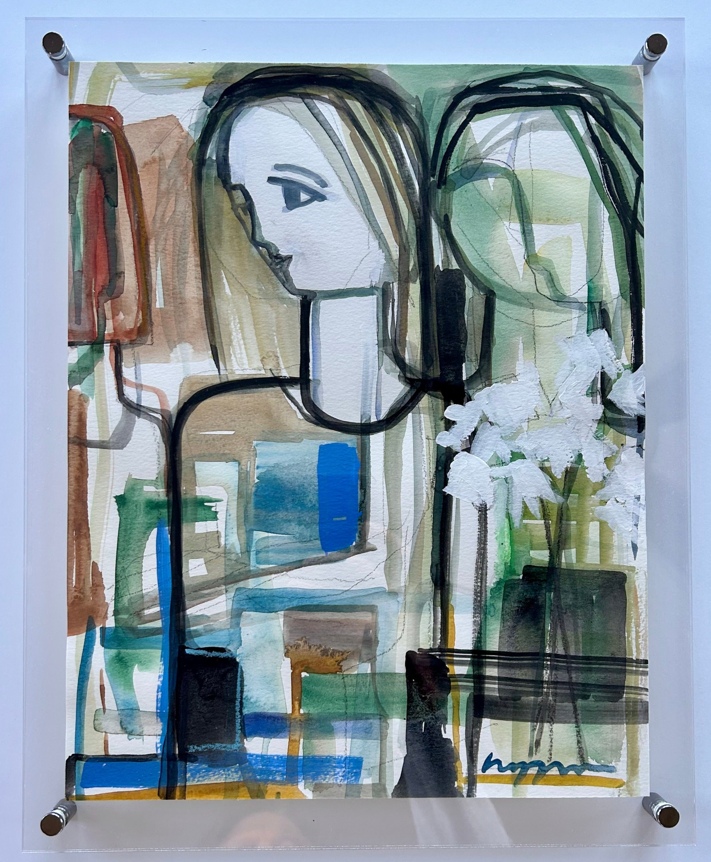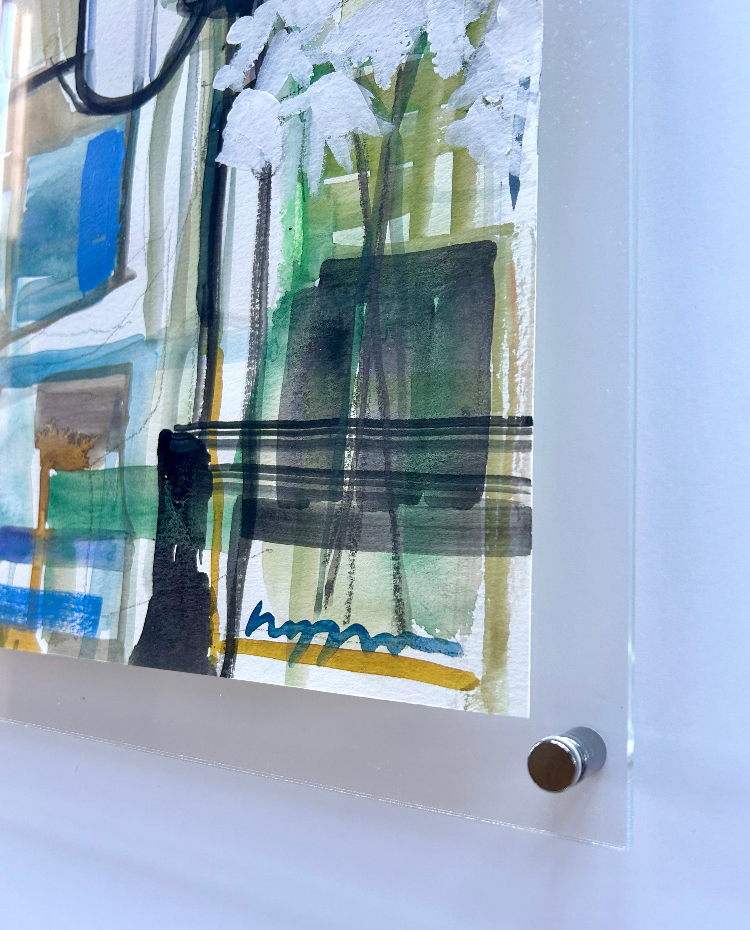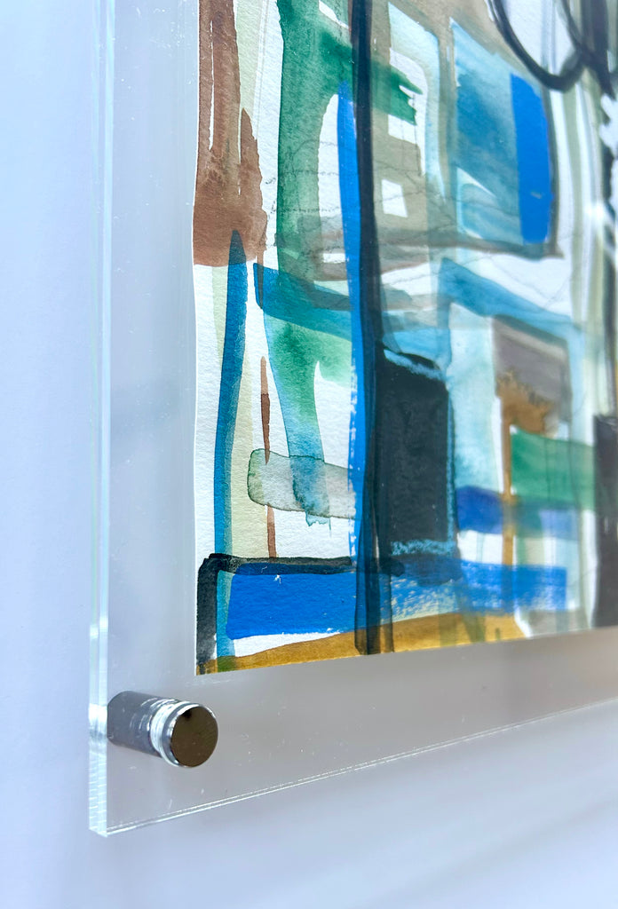 watercolor, acrylic and pencil on paper, in acrylic frame