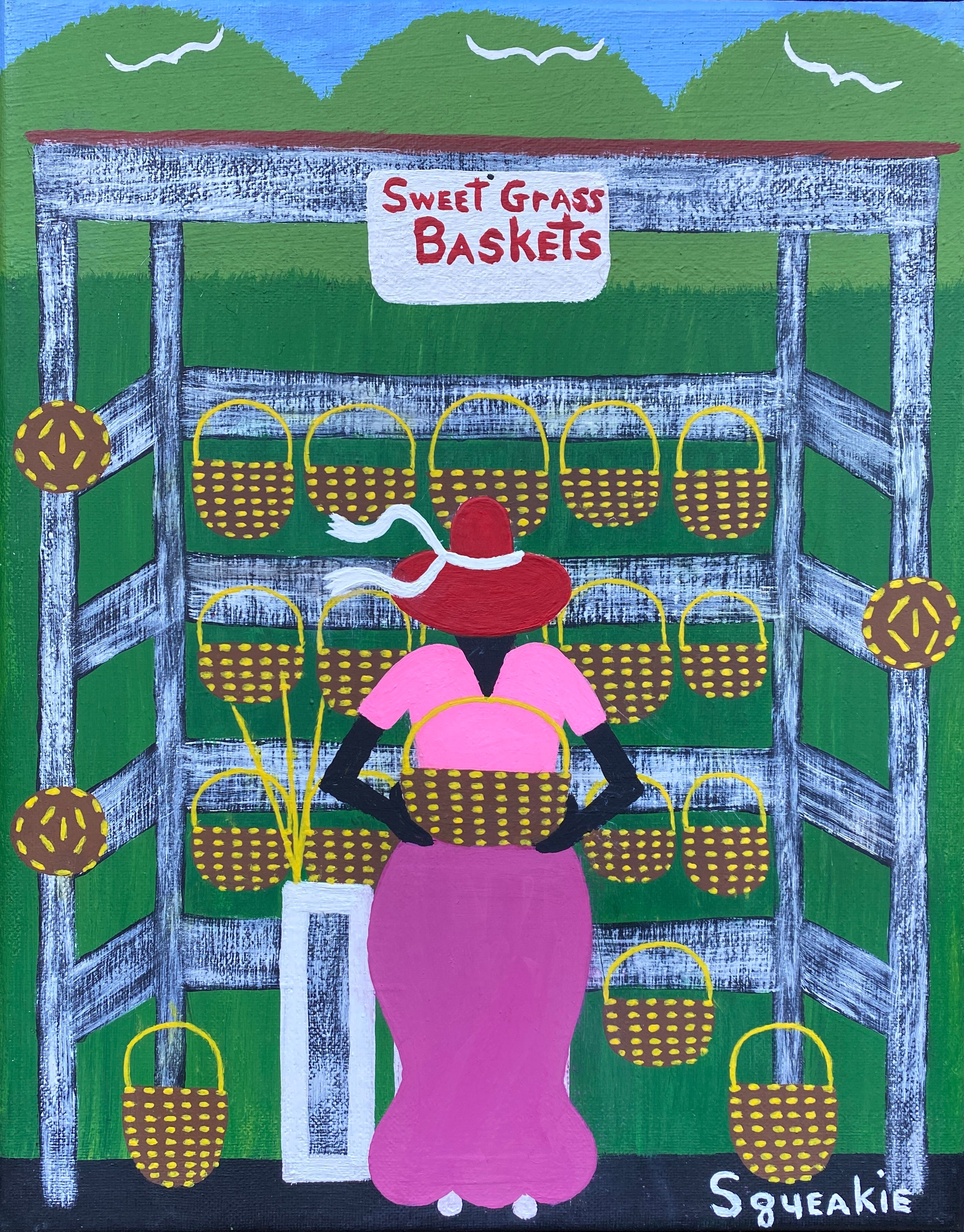 Squeakie is a self-taught artist from the rural Lowcountry whose nostalgic paintings portray a simpler way of life in Coastal South Carolina. He draws his inspiration from memories of childhood where he often worked in tobacco and cotton fields. He talks about this time in his life as "the work was hard, but life was slower, more simple- not so many distractions and bills to pay." He went on to work in factories and grocery stores until he became a house painter for nearly 25 years. Like many self-taught artists, Squeakie did not start creatively painting until later in his life. He was encouraged to do so by his Uncle Henry "Squirrel" Stone, who was a folk artist himself. One of Squirrel's clients asked for a commissioned painting of a church. Squirrel passed this commission on to Squeakie. Since that first painting, Squeakie has a resolute sense of purpose in his work. In 2007 he became a full-time artist, and now his "naive, down-home pictures" have been bought by collectors across the United States, and abroad. He says he paints more now than when he painted houses as his paintings tend to get snapped up quickly.