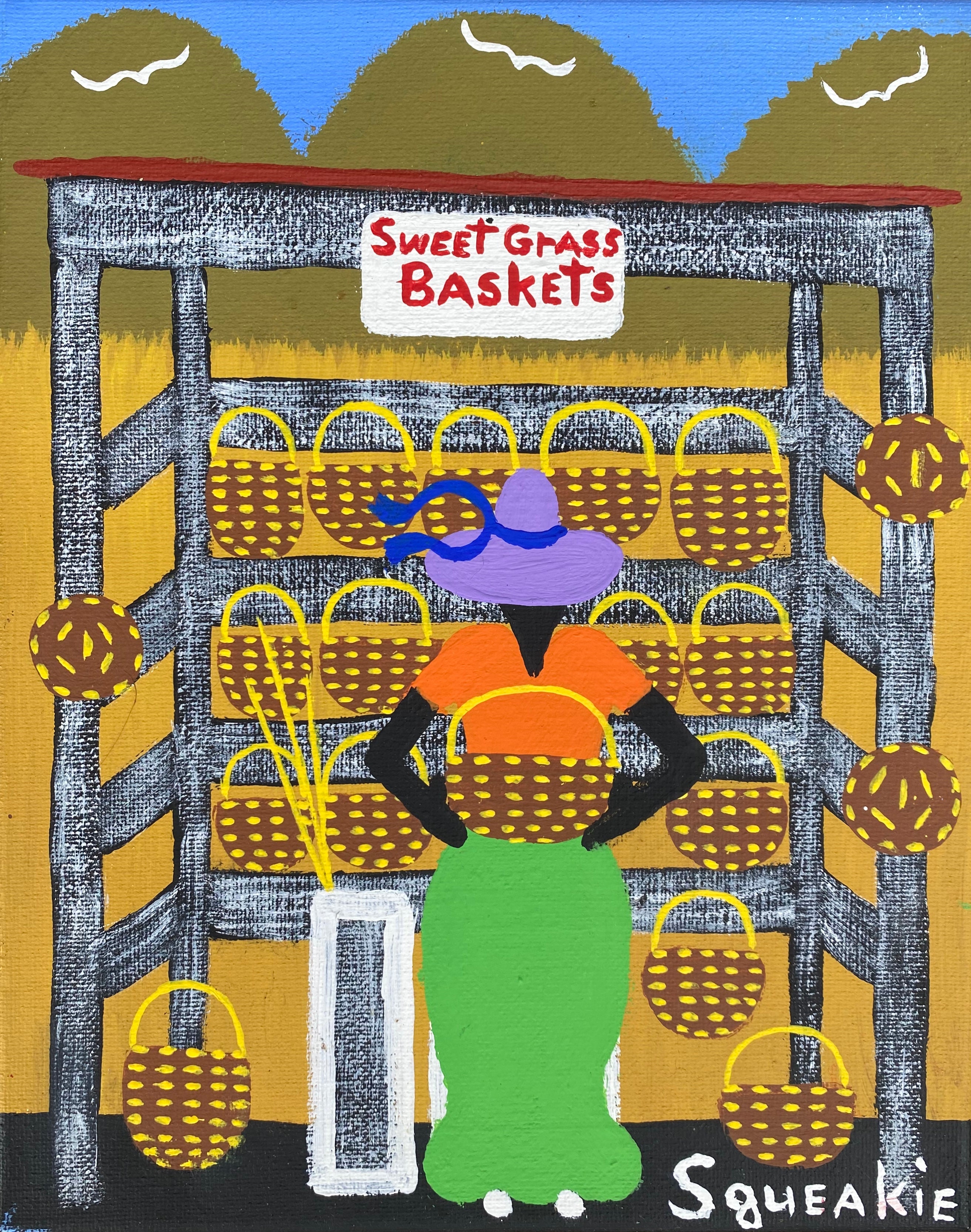 Squeakie is a self-taught artist from the rural Lowcountry whose nostalgic paintings portray a simpler way of life in Coastal South Carolina. He draws his inspiration from memories of childhood where he often worked in tobacco and cotton fields. He talks about this time in his life as "the work was hard, but life was slower, more simple- not so many distractions and bills to pay." He went on to work in factories and grocery stores until he became a house painter for nearly 25 years. Like many self-taught artists, Squeakie did not start creatively painting until later in his life. He was encouraged to do so by his Uncle Henry "Squirrel" Stone, who was a folk artist himself. One of Squirrel's clients asked for a commissioned painting of a church. Squirrel passed this commission on to Squeakie. Since that first painting, Squeakie has a resolute sense of purpose in his work. In 2007 he became a full-time artist, and now his "naive, down-home pictures" have been bought by collectors across the United States, and abroad. He says he paints more now than when he painted houses as his paintings tend to get snapped up quickly.