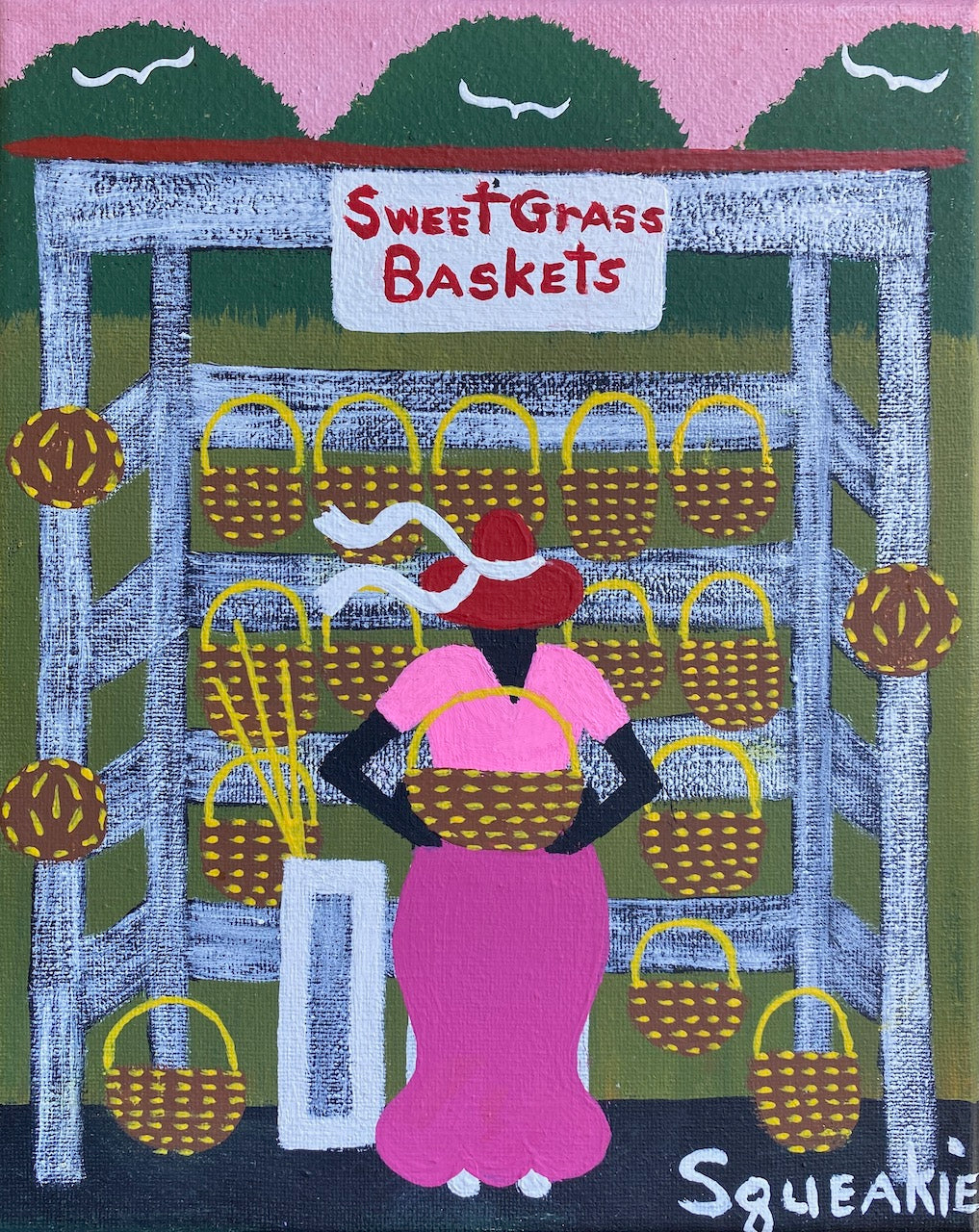 Squeakie is a self-taught artist from the rural Lowcountry whose nostalgic paintings portray a simpler way of life in Coastal South Carolina. He draws his inspiration from memories of childhood where he often worked in tobacco and cotton fields. He talks about this time in his life as "the work was hard, but life was slower, more simple- not so many distractions and bills to pay." He went on to work in factories and grocery stores until he became a house painter for nearly 25 years. Like many self-taught artists, Squeakie did not start creatively painting until later in his life. He was encouraged to do so by his Uncle Henry "Squirrel" Stone, who was a folk artist himself. One of Squirrel's clients asked for a commissioned painting of a church. Squirrel passed this commission on to Squeakie. Since that first painting, Squeakie has a resolute sense of purpose in his work. In 2007 he became a full-time artist, and now his "naive, down-home pictures" have been bought by collectors across the United States, and abroad. He says he paints more now than when he painted houses as his paintings tend to get snapped up quickly.