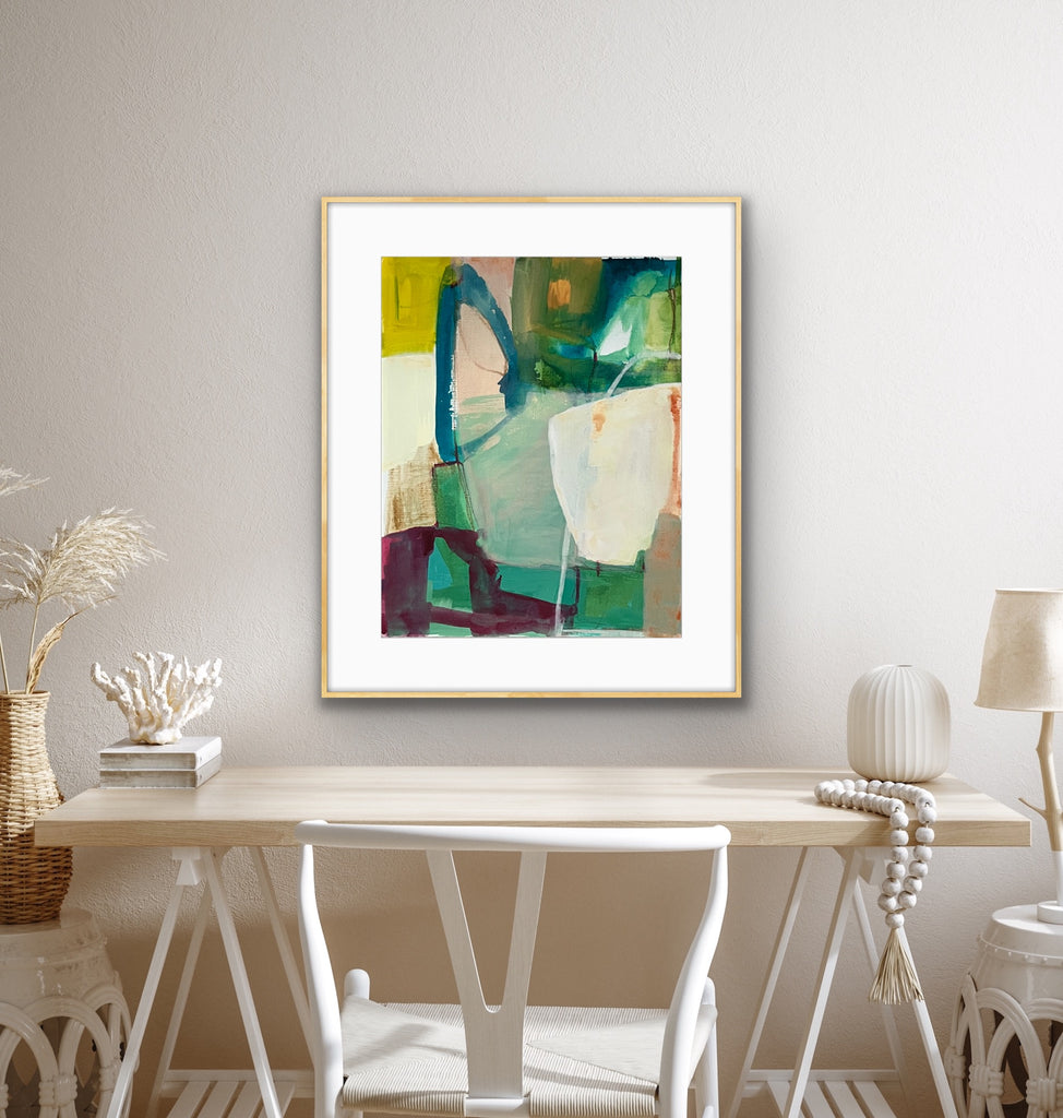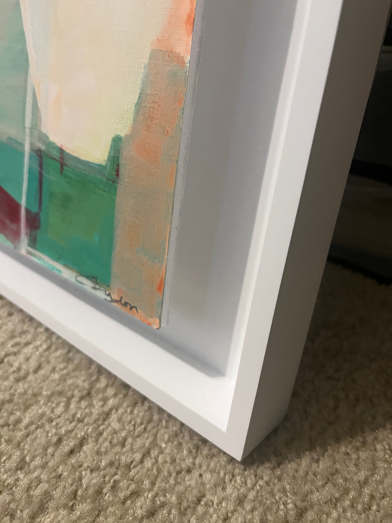 acrylic on paper, mounted in white floater frame