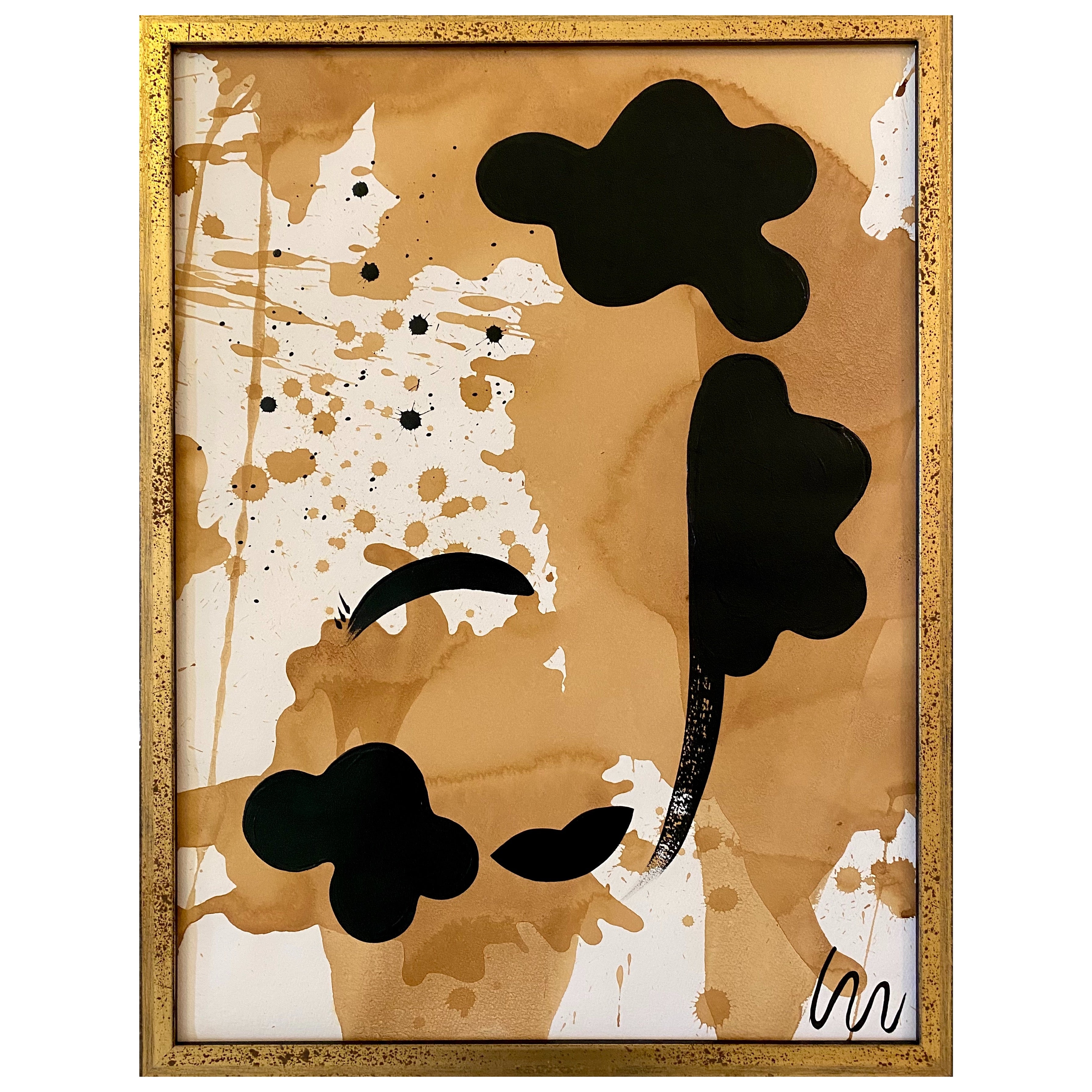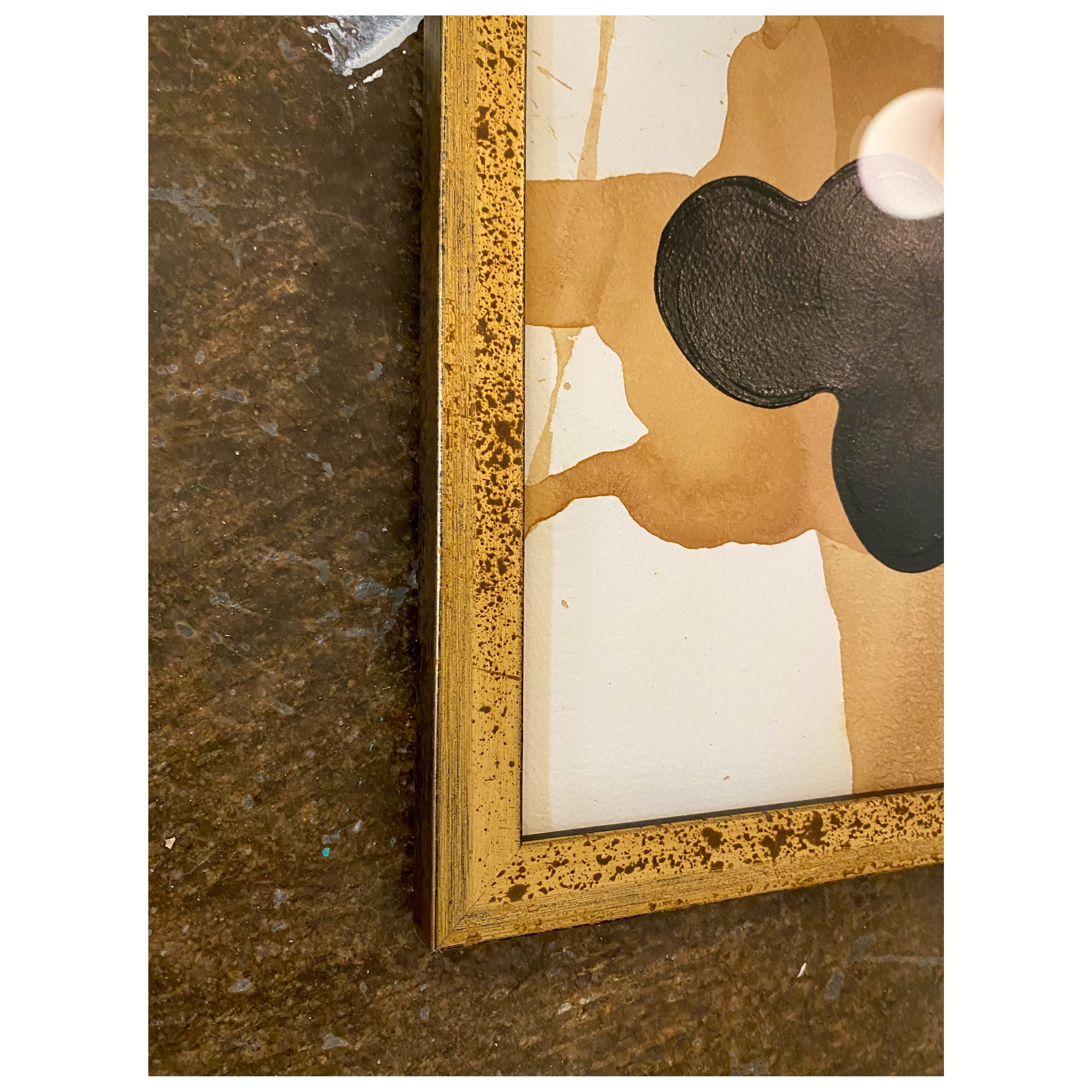 acrylic on tea stained paper, in speckled gold frame with museum glass