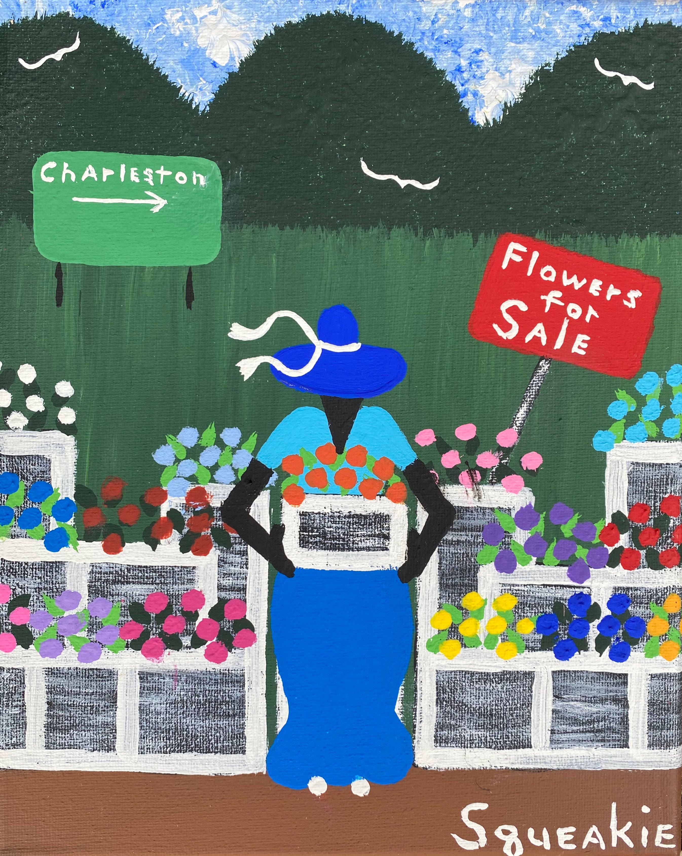 Squeakie is a self-taught artist from the rural Lowcountry whose nostalgic paintings portray a simpler way of life in Coastal South Carolina. He draws his inspiration from memories of childhood where he often worked in tobacco and cotton fields. He talks about this time in his life as "the work was hard, but life was slower, more simple- not so many distractions and bills to pay." He went on to work in factories and grocery stores until he became a house painter for nearly 25 years. Like many self-taught artists, Squeakie did not start creatively painting until later in his life. He was encouraged to do so by his Uncle Henry "Squirrel" Stone, who was a folk artist himself. One of Squirrel's clients asked for a commissioned painting of a church. Squirrel passed this commission on to Squeakie. Since that first painting, Squeakie has a resolute sense of purpose in his work. In 2007 he became a full-time artist, and now his "naive, down-home pictures" have been bought by collectors across the United States, and abroad. He says he paints more now than when he painted houses as his paintings tend to get snapped up quickly.