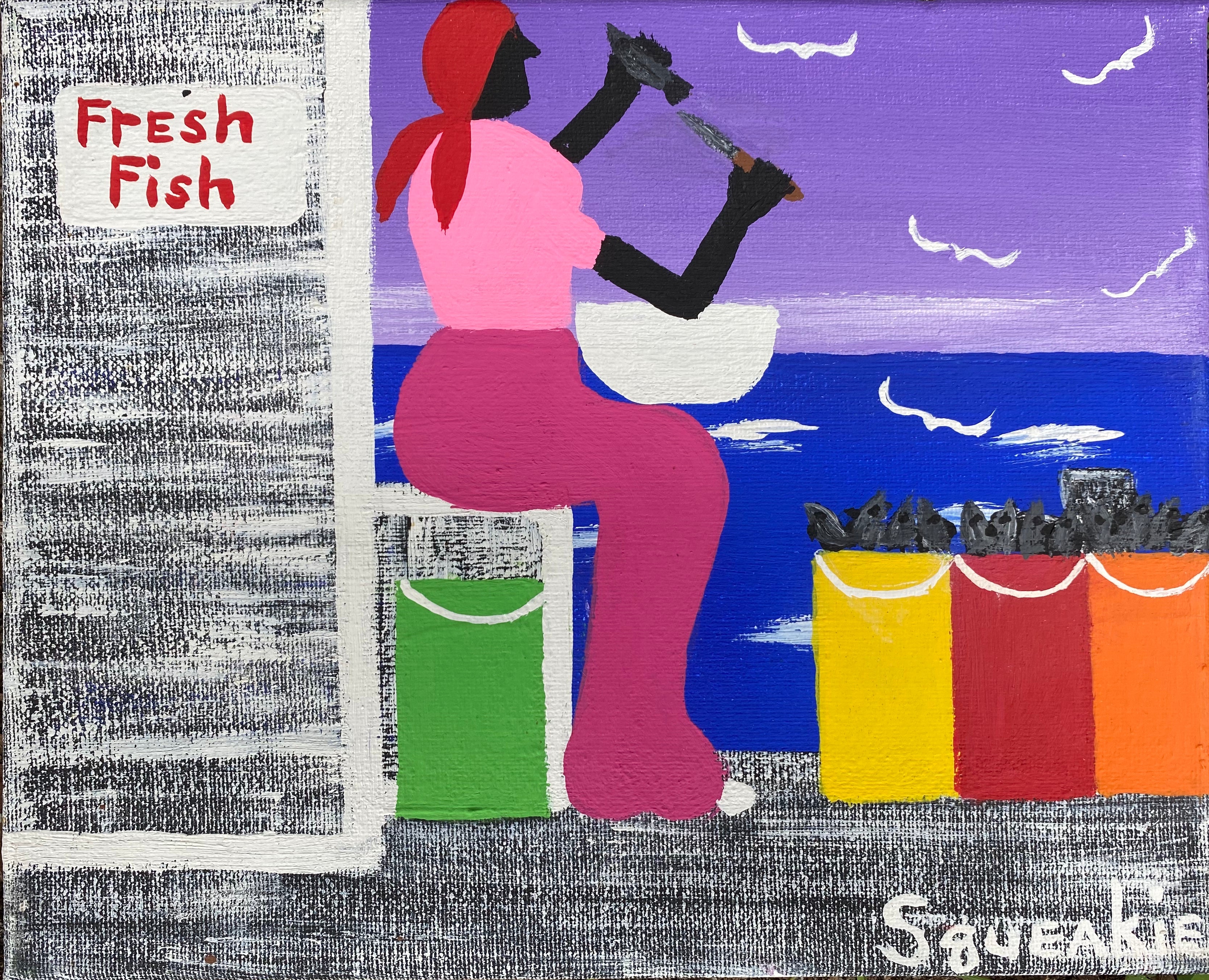 Squeakie is a self-taught artist from the rural Lowcountry whose nostalgic paintings portray a simpler way of life in Coastal South Carolina. He draws his inspiration from memories of childhood where he often worked in tobacco and cotton fields. He talks about this time in his life as "the work was hard, but life was slower, more simple- not so many distractions and bills to pay." He went on to work in factories and grocery stores until he became a house painter for nearly 25 years. Like many self-taught artists, Squeakie did not start creatively painting until later in his life. He was encouraged to do so by his Uncle Henry "Squirrel" Stone, who was a folk artist himself. One of Squirrel's clients asked for a commissioned painting of a church. Squirrel passed this commission on to Squeakie. Since that first painting, Squeakie has a resolute sense of purpose in his work. In 2007 he became a full-time artist, and now his "naive, down-home pictures" have been bought by collectors across the United States, and abroad. He says he paints more now than when he painted houses as his paintings tend to get snapped up quickly.