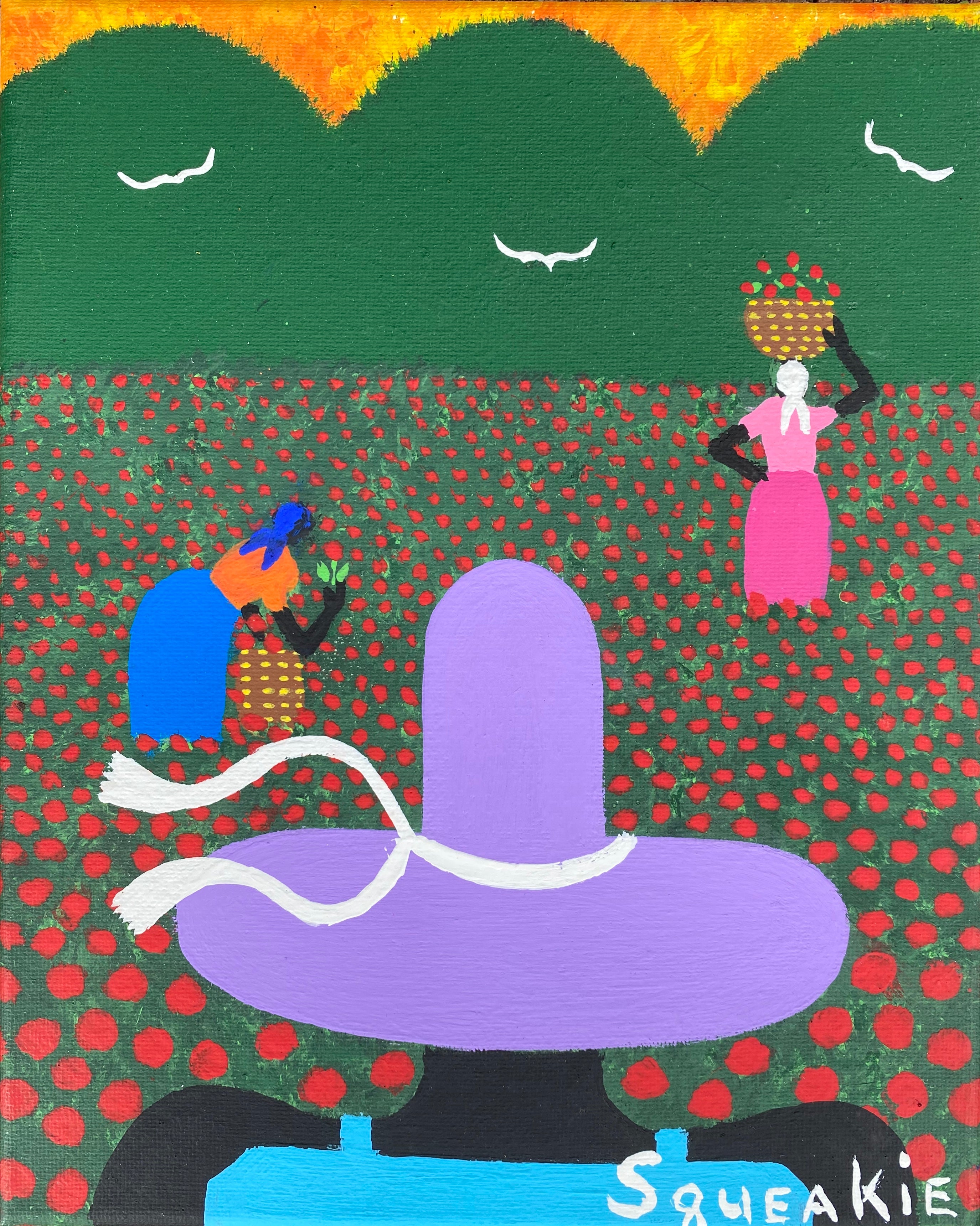 Squeakie is a self-taught artist from the rural Lowcountry whose nostalgic paintings portray a simpler way of life in Coastal South Carolina. He draws his inspiration from memories of childhood where he often worked in tobacco and cotton fields. He talks about this time in his life as "the work was hard, but life was slower, more simple- not so many distractions and bills to pay." He went on to work in factories and grocery stores until he became a house painter for nearly 25 years. Like many self-taught artists, Squeakie did not start creatively painting until later in his life. He was encouraged to do so by his Uncle Henry "Squirrel" Stone, who was a folk artist himself. One of Squirrel's clients asked for a commissioned painting of a church. Squirrel passed this commission on to Squeakie. Since that first painting, Squeakie has a resolute sense of purpose in his work. In 2007 he became a full-time artist, and now his "naive, down-home pictures" have been bought by collectors across the United States, and abroad. He says he paints more now than when he painted houses as his paintings tend to get snapped up quickly.