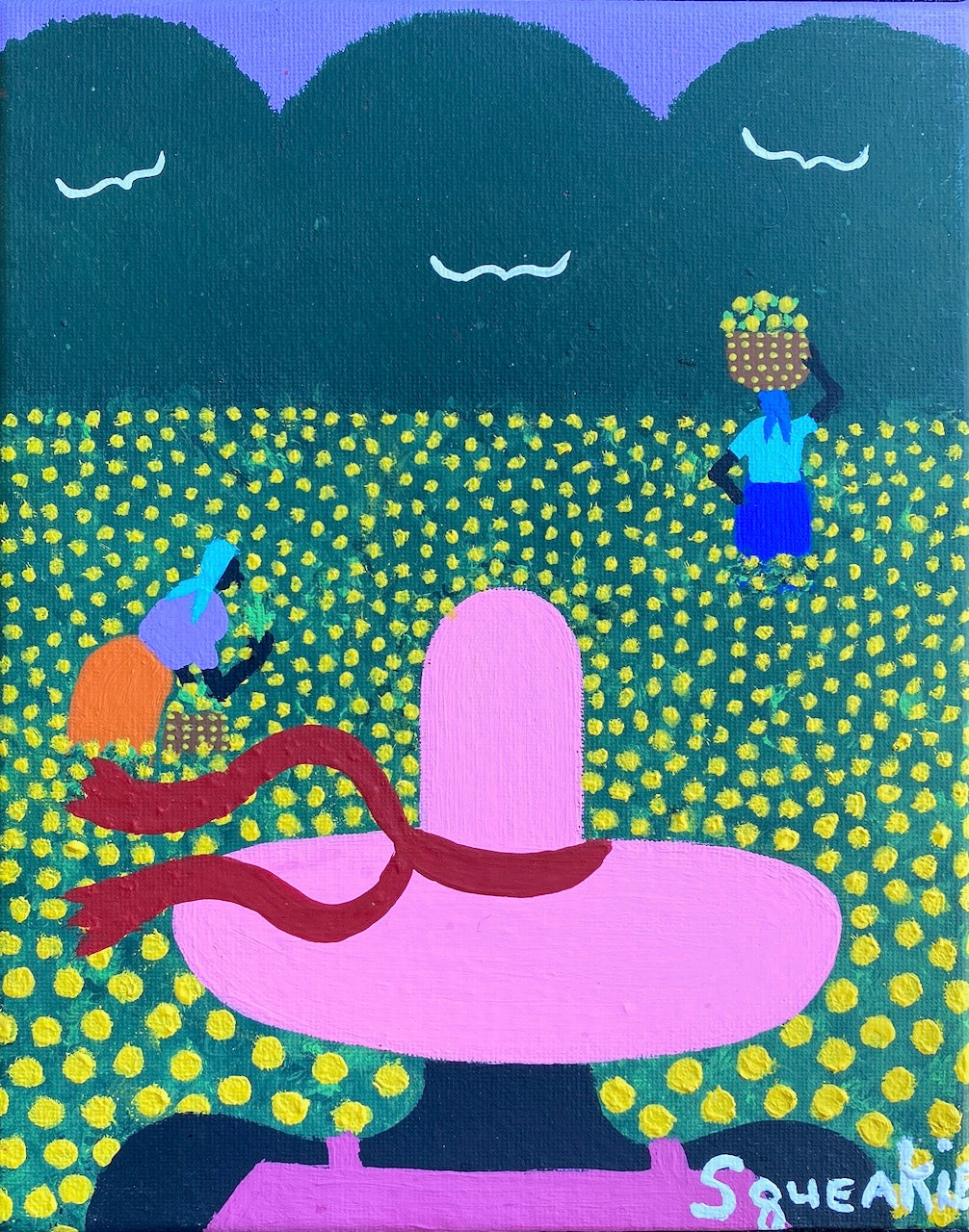 Squeakie is a self-taught artist from the rural Lowcountry whose nostalgic paintings portray a simpler way of life in Coastal South Carolina. He draws his inspiration from memories of childhood where he often worked in tobacco and cotton fields. He talks about this time in his life as "the work was hard, but life was slower, more simple- not so many distractions and bills to pay." He went on to work in factories and grocery stores until he became a house painter for nearly 25 years. Like many self-taught artists, Squeakie did not start creatively painting until later in his life. He was encouraged to do so by his Uncle Henry "Squirrel" Stone, who was a folk artist himself. One of Squirrel's clients asked for a commissioned painting of a church. Squirrel passed this commission on to Squeakie. Since that first painting, Squeakie has a resolute sense of purpose in his work. In 2007 he became a full-time artist, and now his "naive, down-home pictures" have been bought by collectors across the United States, and abroad. He says he paints more now than when he painted houses as his paintings tend to get snapped up quickly.
