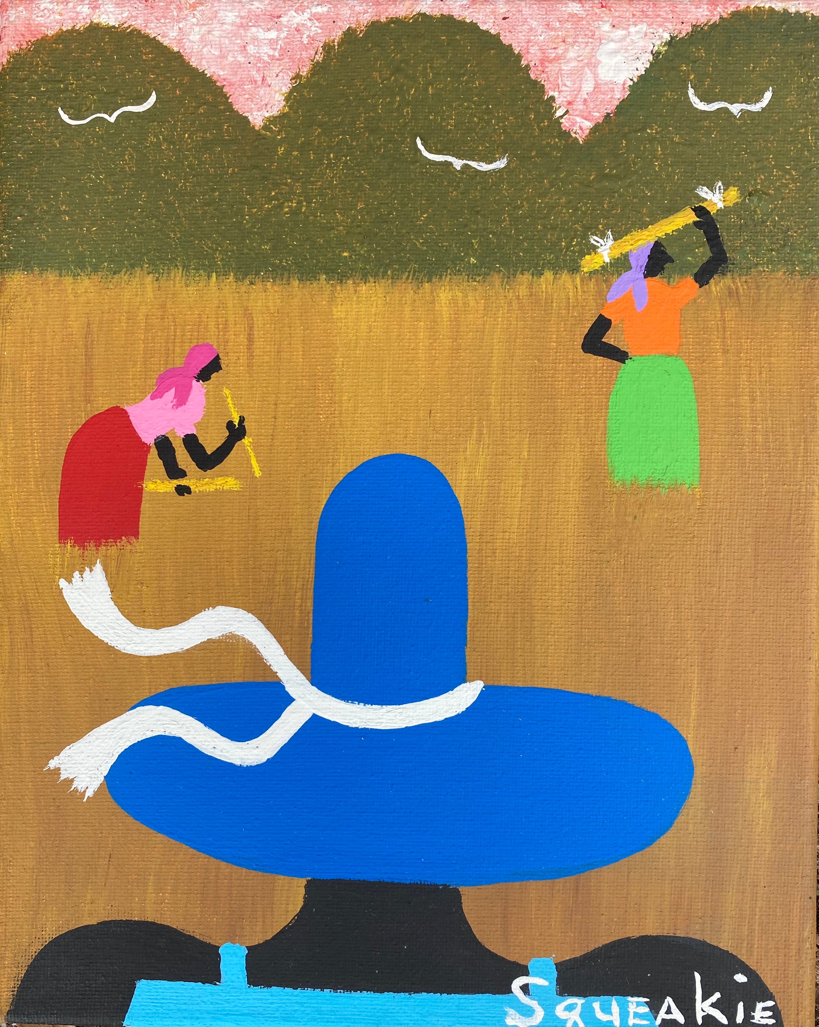 Squeakie is a self-taught artist from the rural Lowcountry whose nostalgic paintings portray a simpler way of life in Coastal South Carolina. He draws his inspiration from memories of childhood where he often worked in tobacco and cotton fields. He talks about this time in his life as "the work was hard, but life was slower, more simple- not so many distractions and bills to pay." He went on to work in factories and grocery stores until he became a house painter for nearly 25 years. Like many self-taught artists, Squeakie did not start creatively painting until later in his life. He was encouraged to do so by his Uncle Henry "Squirrel" Stone, who was a folk artist himself. One of Squirrel's clients asked for a commissioned painting of a church. Squirrel passed this commission on to Squeakie. Since that first painting, Squeakie has a resolute sense of purpose in his work. In 2007 he became a full-time artist, and now his "naive, down-home pictures" have been bought by collectors across the United States, and abroad. He says he paints more now than when he painted houses as his paintings tend to get snapped up quickly.