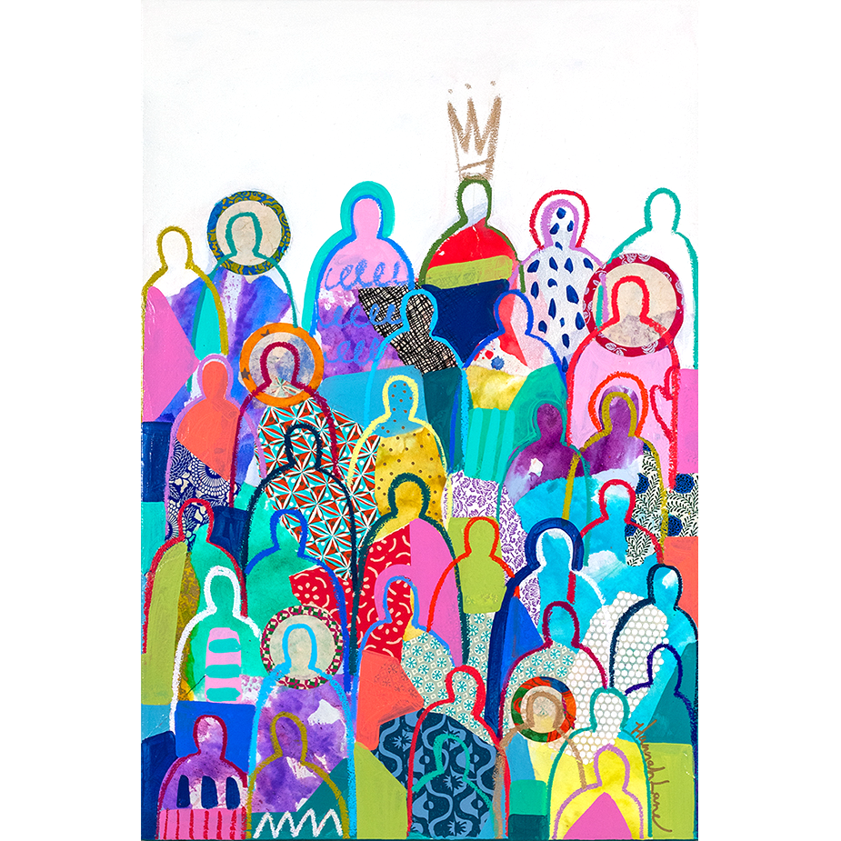 Hannah Lane is a contemporary mixed media artist celebrated for her bold use of color and dynamic, collage-like layering. A Louisiana native and graduate of the Savannah College of Art & Design, Hannah draws deep inspiration from the vibrant landscapes, diverse cultures, and heartfelt sense of family and community found in her southern roots. Her work blends pigmented Japanese papers, expressive line work, and rich washes of acrylic paint to create textured, energetic paintings. Each collection reflects her love for nature, storytelling, and community—an invitation to explore the beauty of her inner imagination. Hannah is represented by some of the top galleries in the Southeast, and her paintings are collected privately and in corporate spaces across the country. She also loves working one-on-one with collectors to create meaningful, custom pieces. After living and painting in Italy and New Orleans, Hannah now calls Nashville home, where she is part of a thriving art community. When she’s not painting in her home studio, you’ll find Hannah hiking with her boys, reading, or cooking up something seasonal and delicious! The crowd series is one of my most iconic collections, inspired by my big, beautiful Louisiana family and the joyful spirit of southern gatherings. I grew up surrounded by cousins, friends, and neighbors—many from families as large and lively as my own—where faith and family were at the heart of everything. Over the past 12 years, this series has evolved with new patterns, papers, and symbols that reflect the changing seasons of life. Each crowd painting is a kind of meditation, a reflection on the deep truth that we’re all connected. Rich with personal symbols and intuitive mark-making, these pieces push the boundaries of mixed media and invite you to see something familiar in a new way. Whether you're drawn to the vibrant energy, the quiet details, or the sense of belonging they evoke, each crowd carries its own unique aura—waiting for the right person to bring it home.