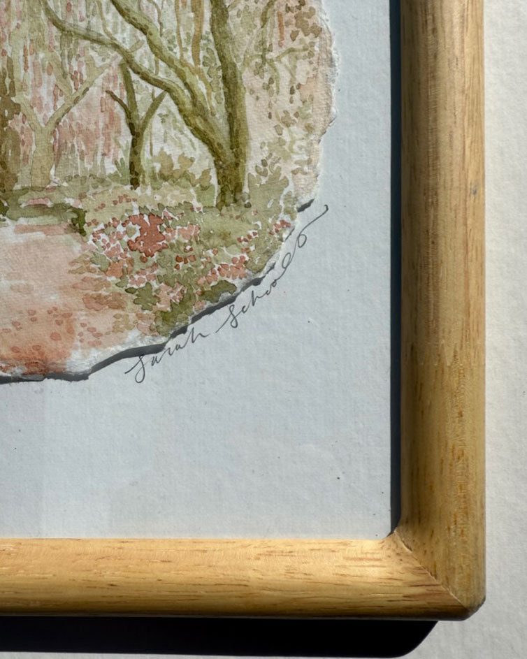 watercolor on cotton deckled edge paper, floating on white mat in natural wood frame with rounded corners