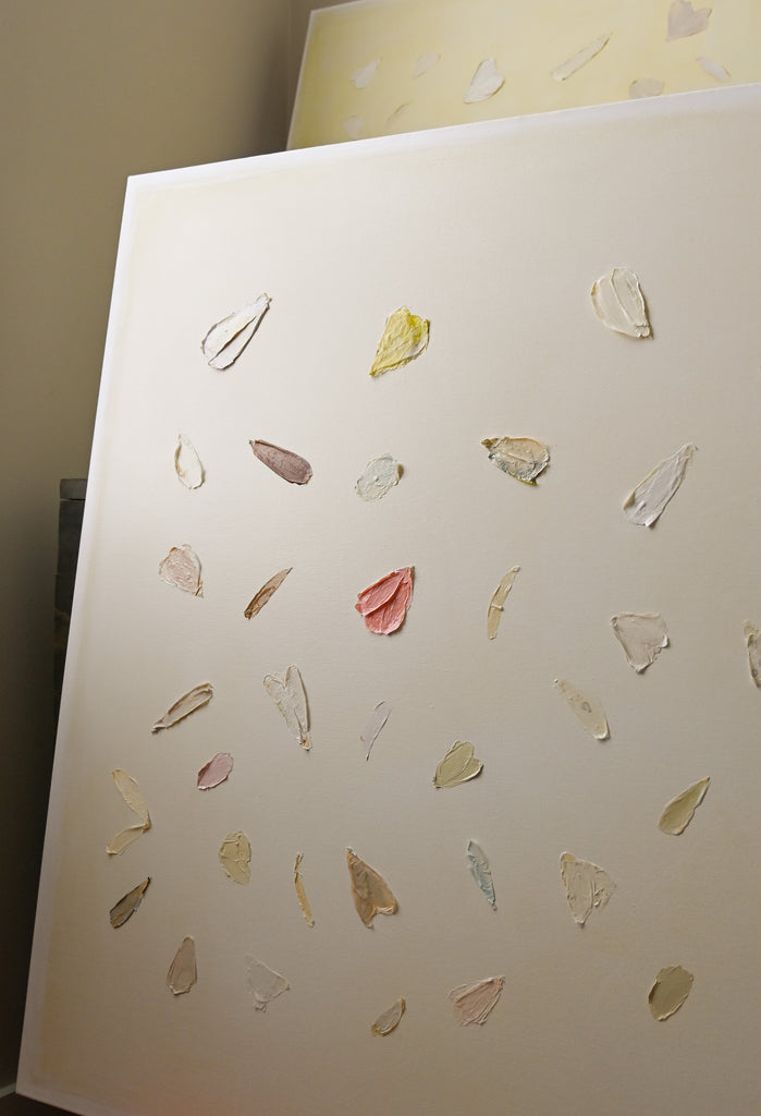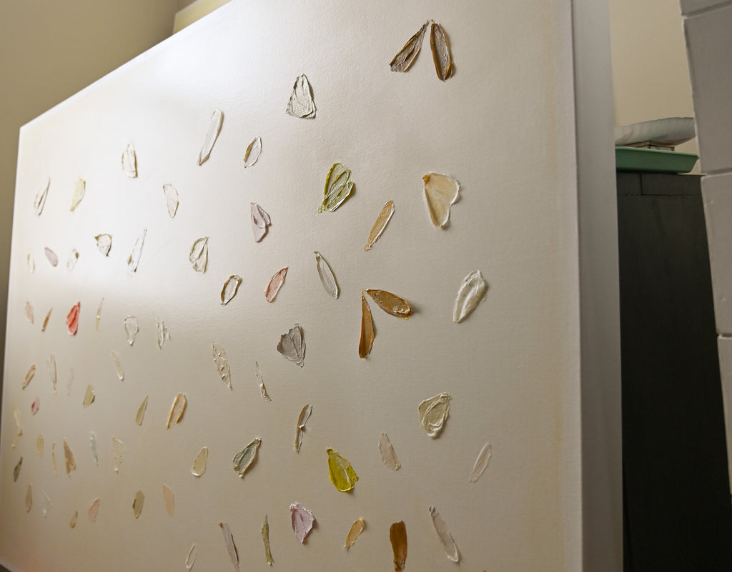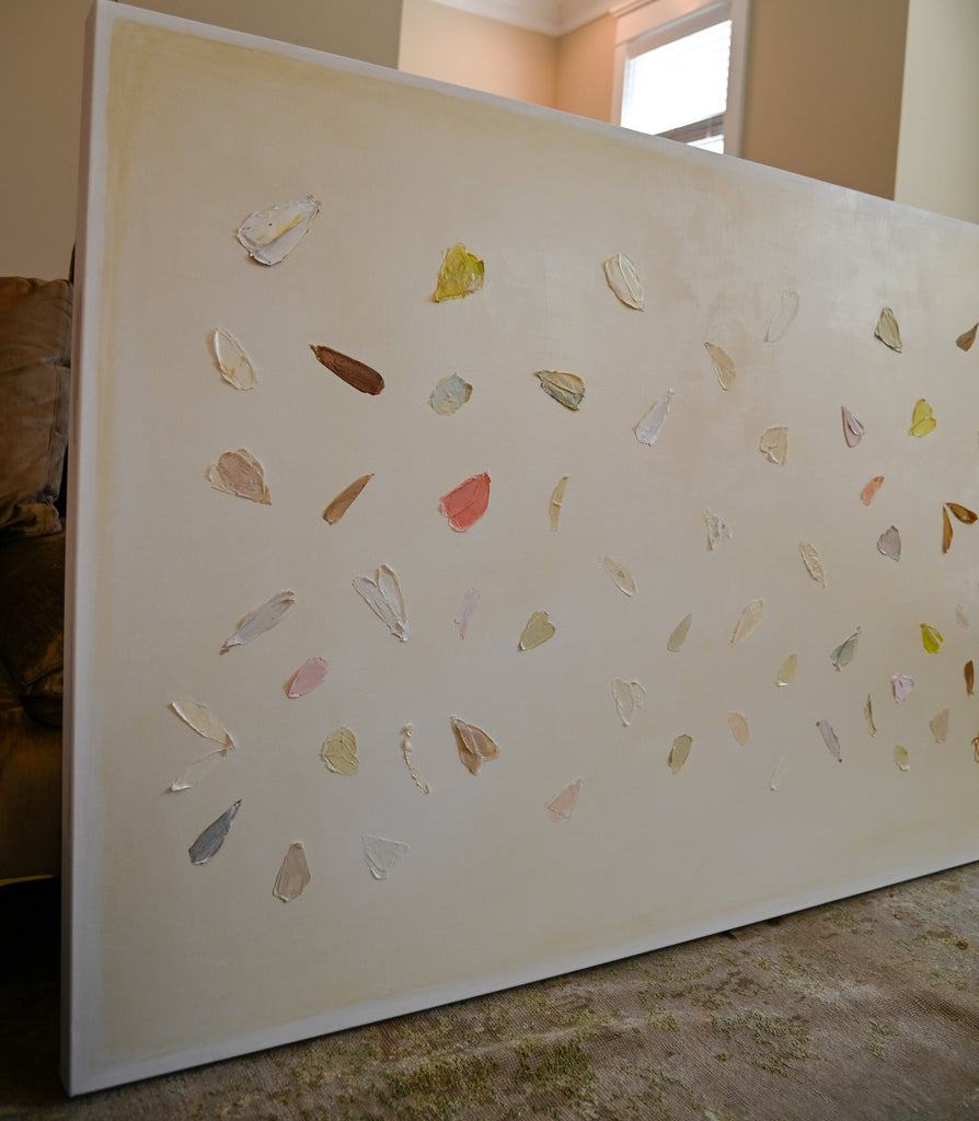 If Diana had a personal motto it would be “everything can be a treasure hunt if you try hard enough.” Growing up in Baton Rouge, Louisiana, Diana was fully trained in the art of the hunt by her mother who would drop all plans at the glimmer of an “Estate Sale Today” sign. Fortunately, this past time led to the ultimate find of a library of art and painting books which sent her in to a rabbit hole of learning about theories, lines, composition, and color that she hasn’t looked back from since. After years of self-study and practice, Diana launched her first collection to the public in fall of 2020. Her first series entitled “The Butterfly Collection” is built upon layers of color, glazers and washes carefully balanced to find the calm in the chaos. Diana names each piece after her favorite inspirational influences from authors to beaches to everyday people in her life that constantly bring her back to awe and wonder. Diana resides in Mount Pleasant, South Carolina with her husband Gabe, and her three boys Dixon, Charles, and Henry. If you are in the area and see a girl with paint chips on her hand digging for shells in the beach or through a stack of books in front of the library, please say hello!