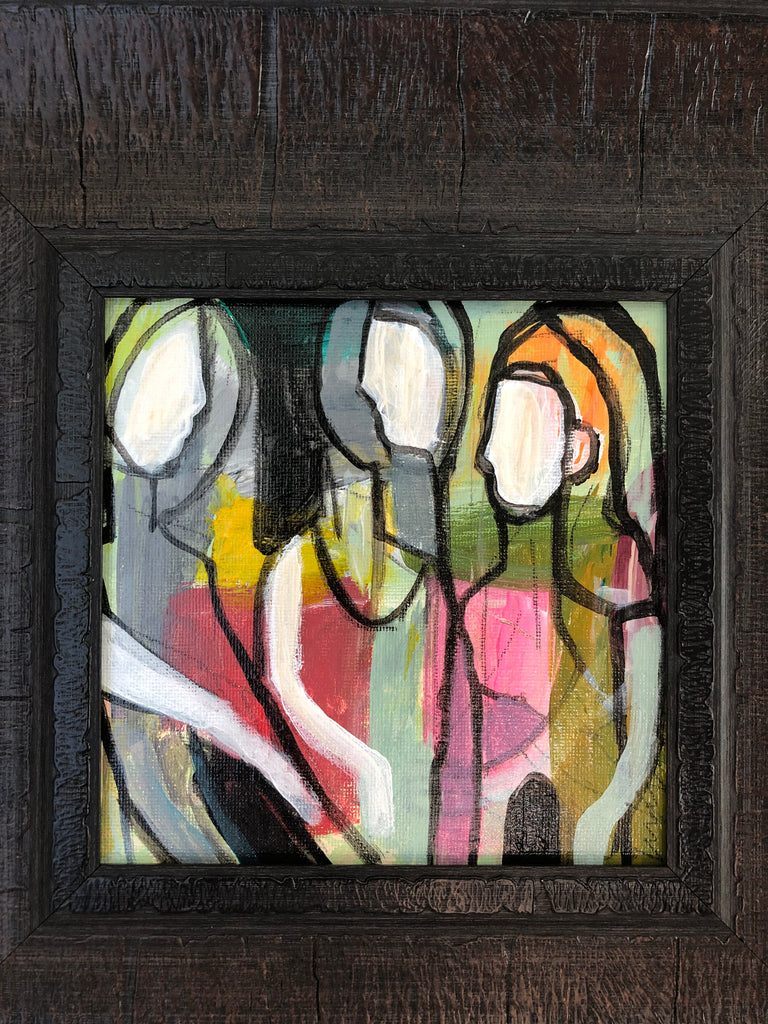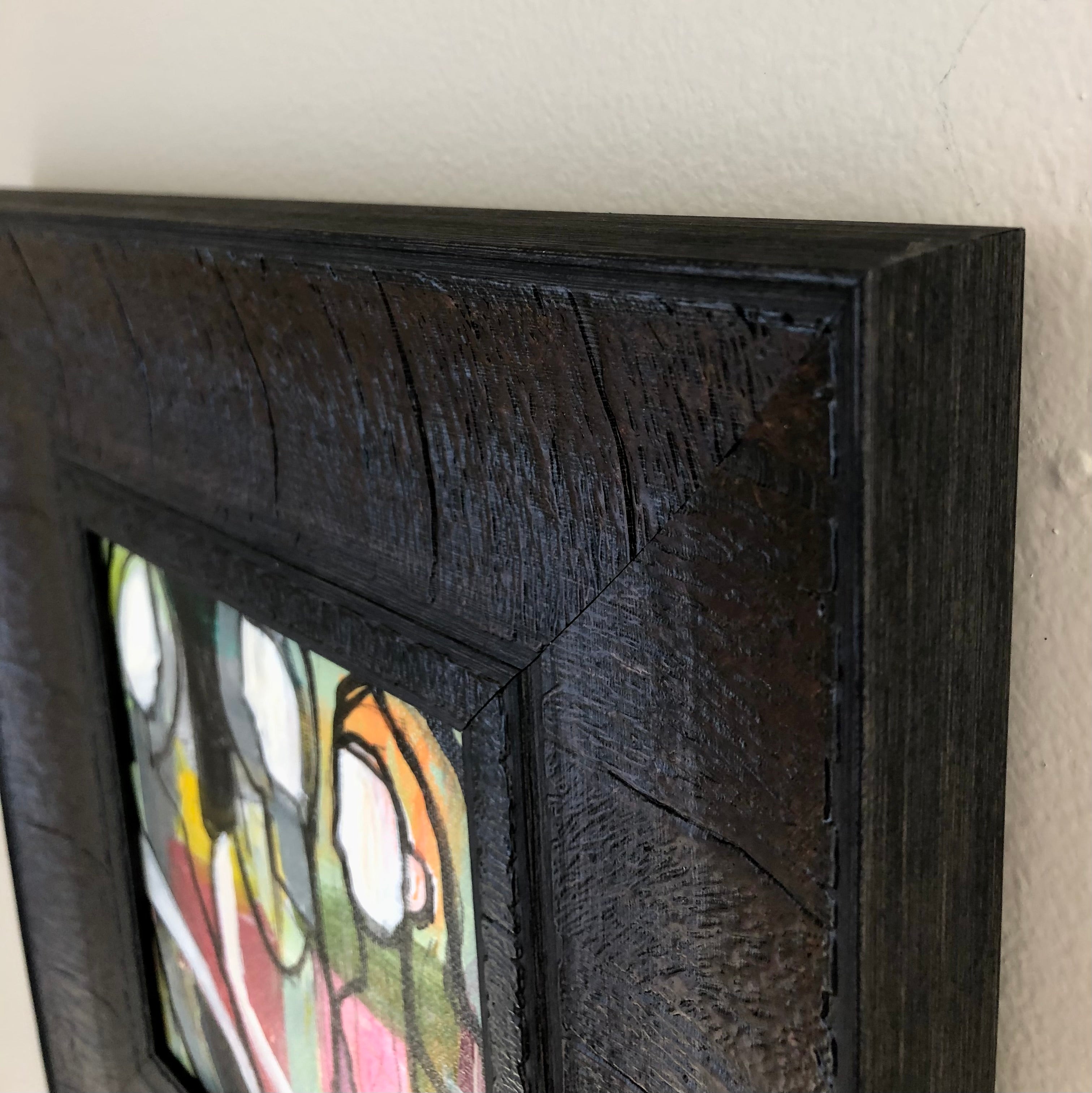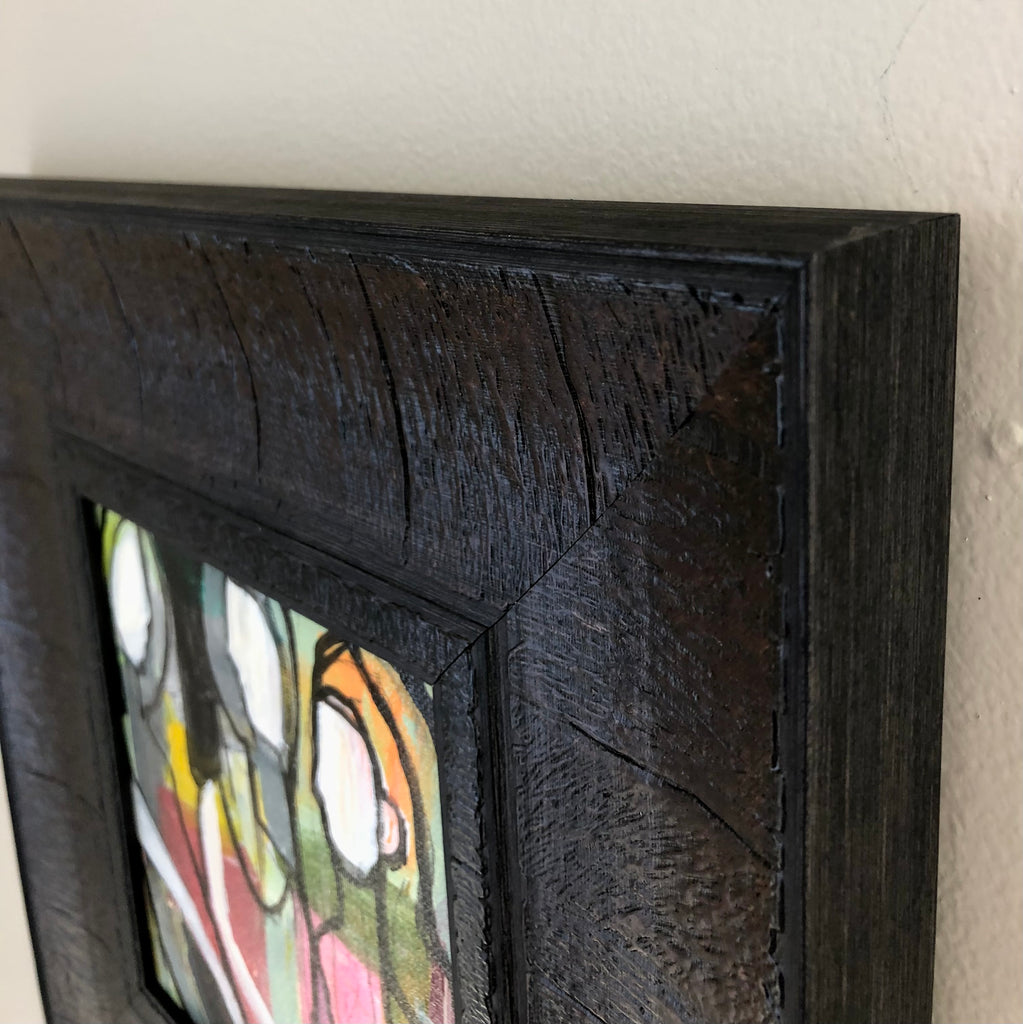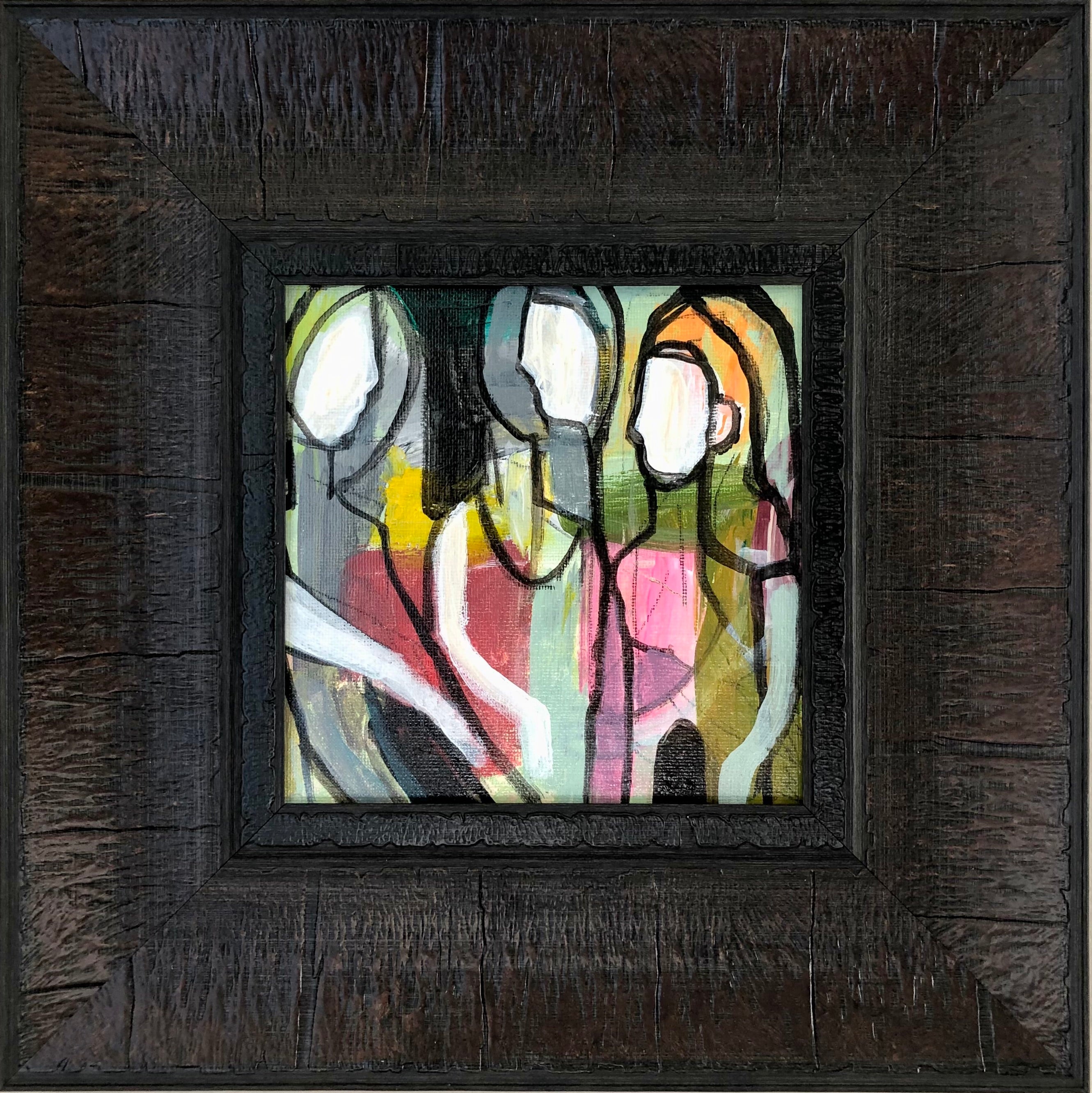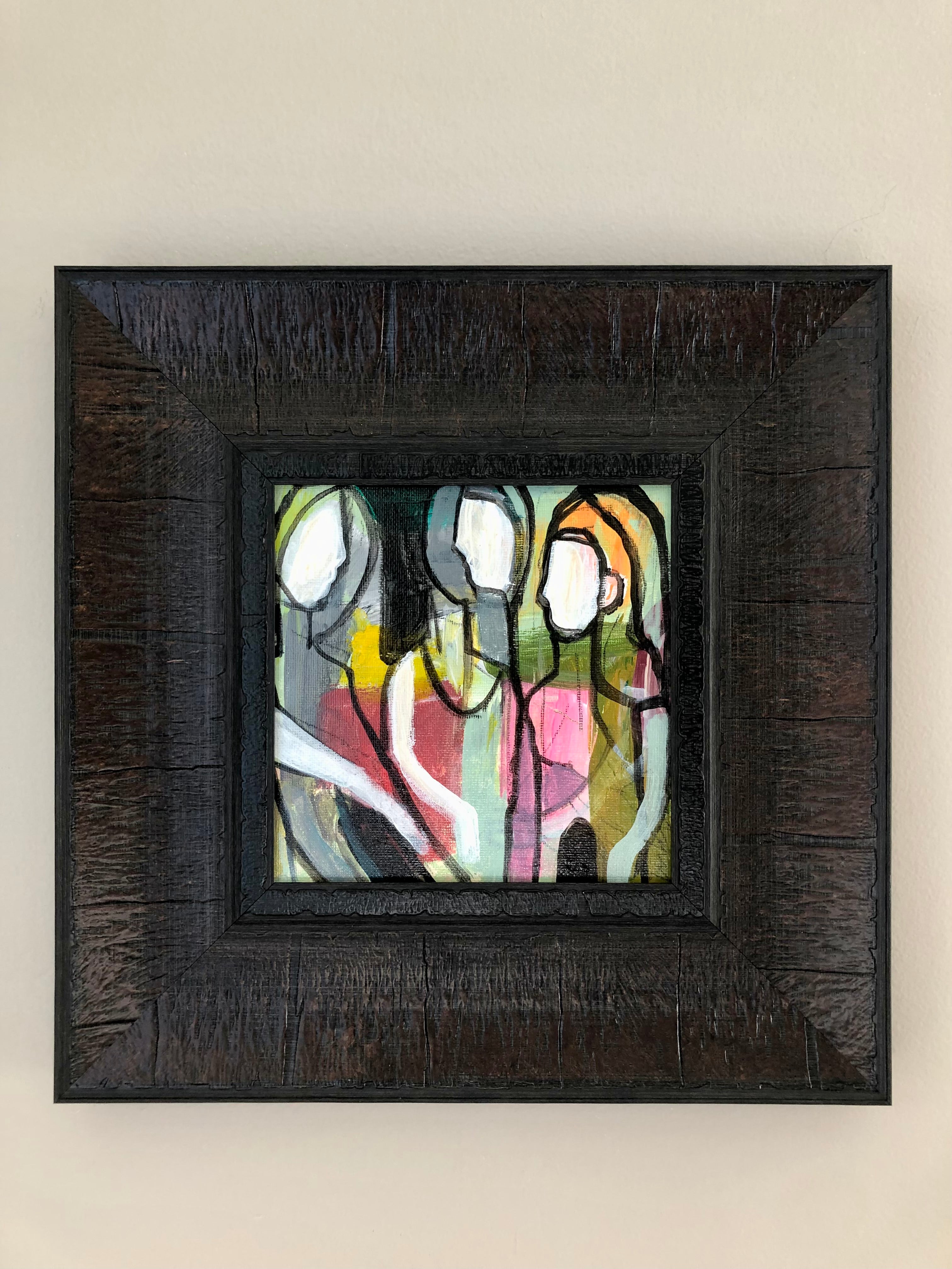 acrylic on canvas panel, in brown frame