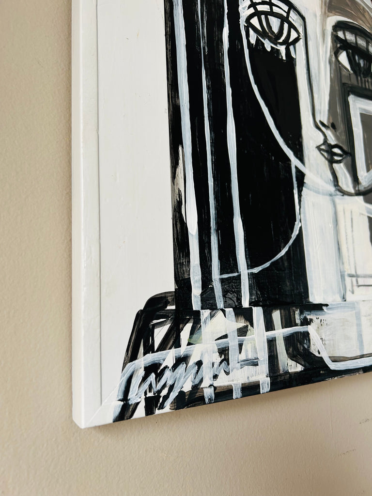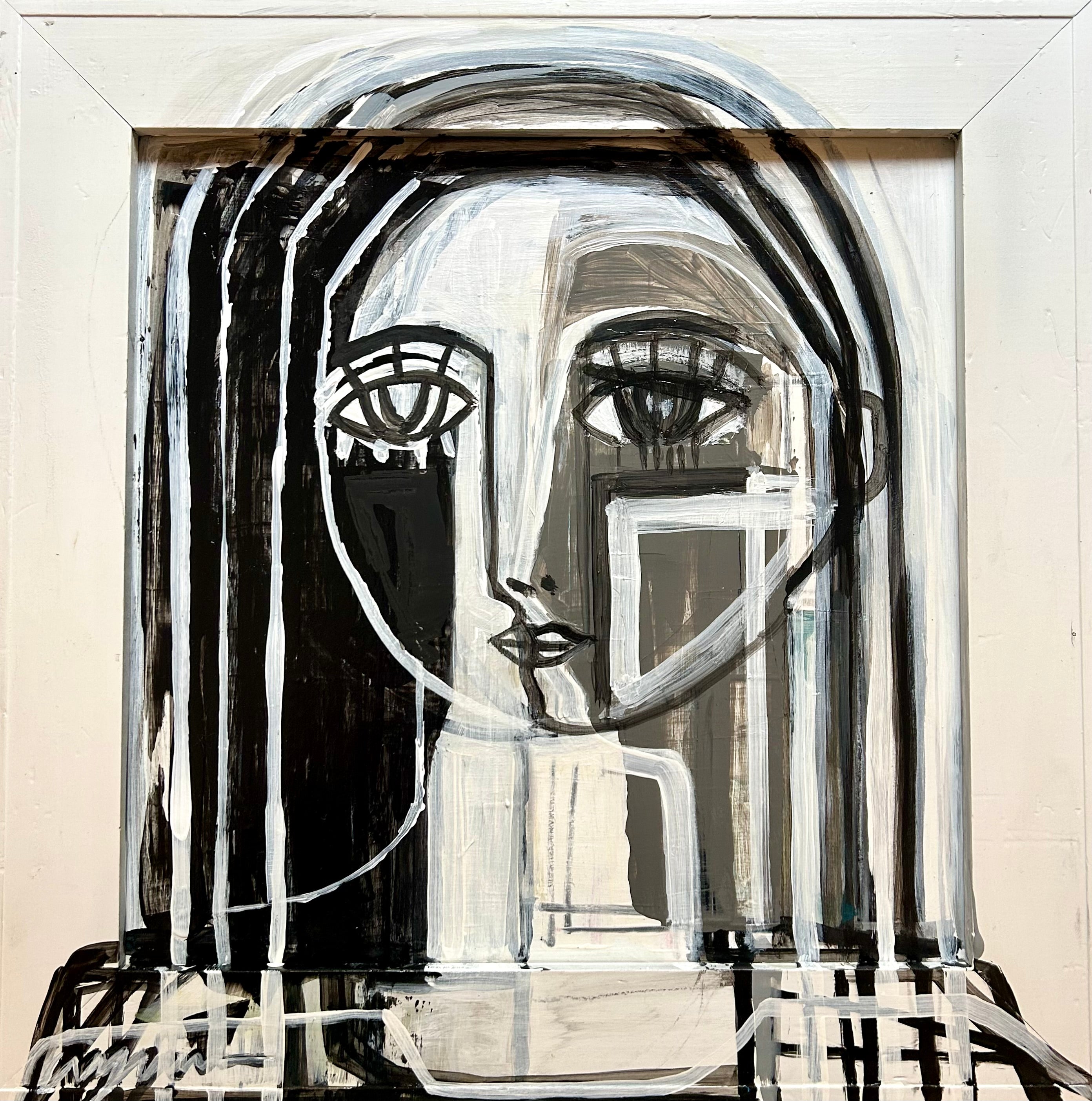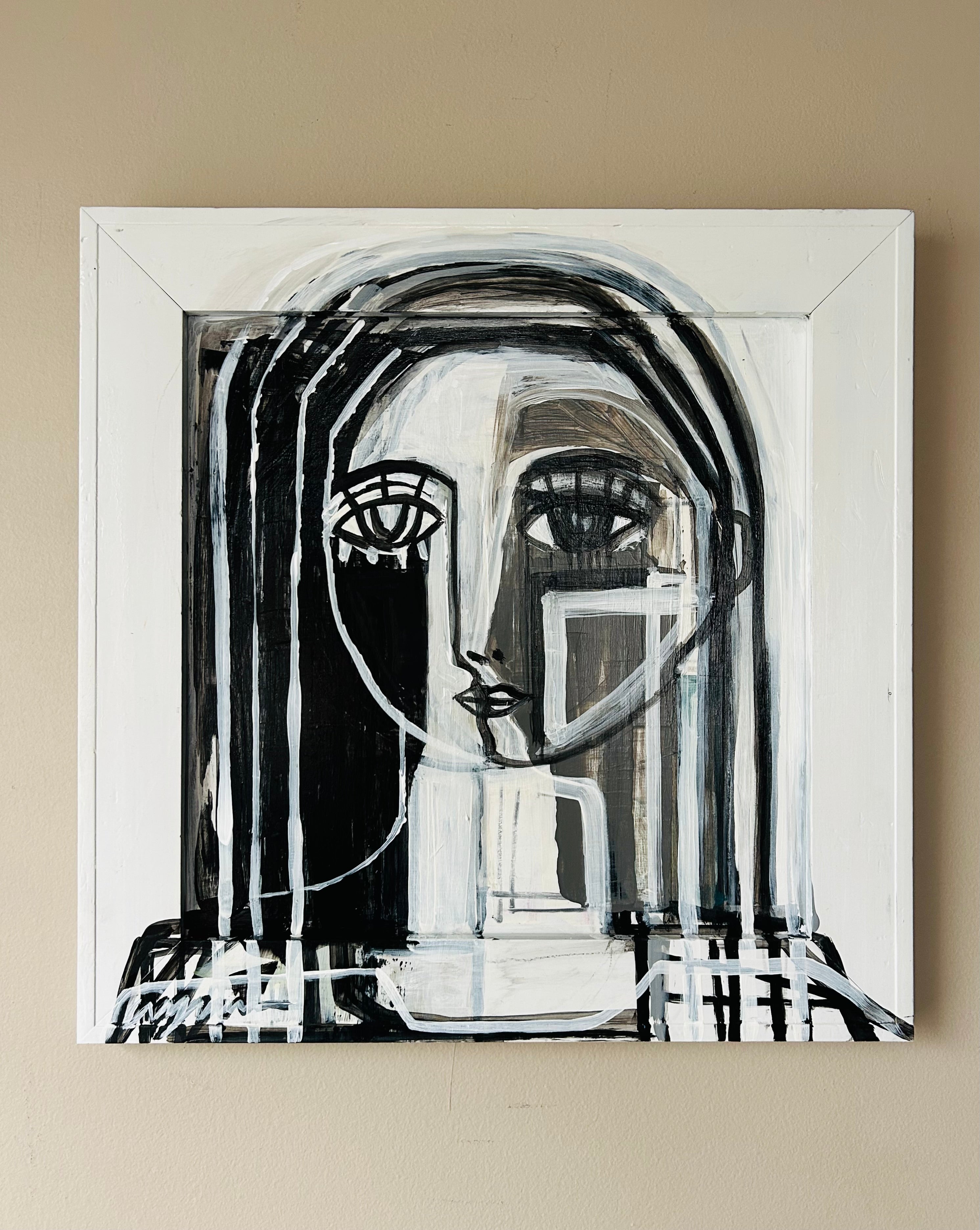 acrylic and enamel on panel, in white wood frame