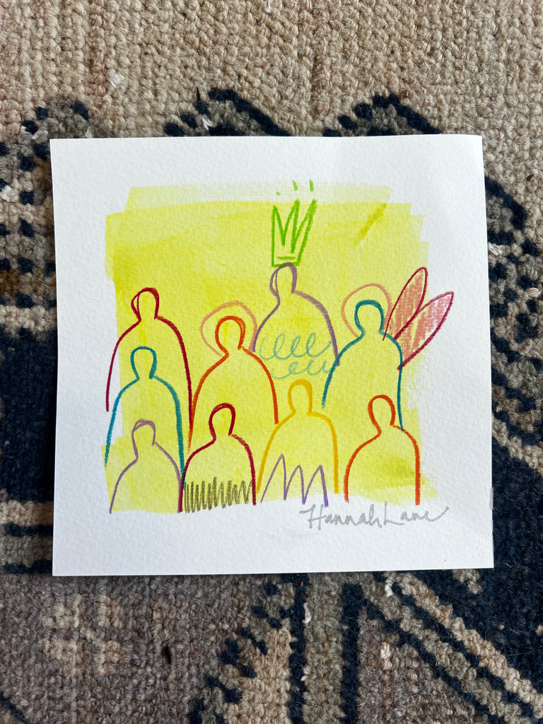 Hannah Lane is a contemporary mixed media artist celebrated for her bold use of color and dynamic, collage-like layering. A Louisiana native and graduate of the Savannah College of Art & Design, Hannah draws deep inspiration from the vibrant landscapes, diverse cultures, and heartfelt sense of family and community found in her southern roots. Her work blends pigmented Japanese papers, expressive line work, and rich washes of acrylic paint to create textured, energetic paintings. Each collection reflects her love for nature, storytelling, and community—an invitation to explore the beauty of her inner imagination. Hannah is represented by some of the top galleries in the Southeast, and her paintings are collected privately and in corporate spaces across the country. She also loves working one-on-one with collectors to create meaningful, custom pieces. After living and painting in Italy and New Orleans, Hannah now calls Nashville home, where she is part of a thriving art community. When she’s not painting in her home studio, you’ll find Hannah hiking with her boys, reading, or cooking up something seasonal and delicious! The crowd series is one of my most iconic collections, inspired by my big, beautiful Louisiana family and the joyful spirit of southern gatherings. I grew up surrounded by cousins, friends, and neighbors—many from families as large and lively as my own—where faith and family were at the heart of everything. Over the past 12 years, this series has evolved with new patterns, papers, and symbols that reflect the changing seasons of life. Each crowd painting is a kind of meditation, a reflection on the deep truth that we’re all connected. Rich with personal symbols and intuitive mark-making, these pieces push the boundaries of mixed media and invite you to see something familiar in a new way. Whether you're drawn to the vibrant energy, the quiet details, or the sense of belonging they evoke, each crowd carries its own unique aura—waiting for the right person to bring it home.