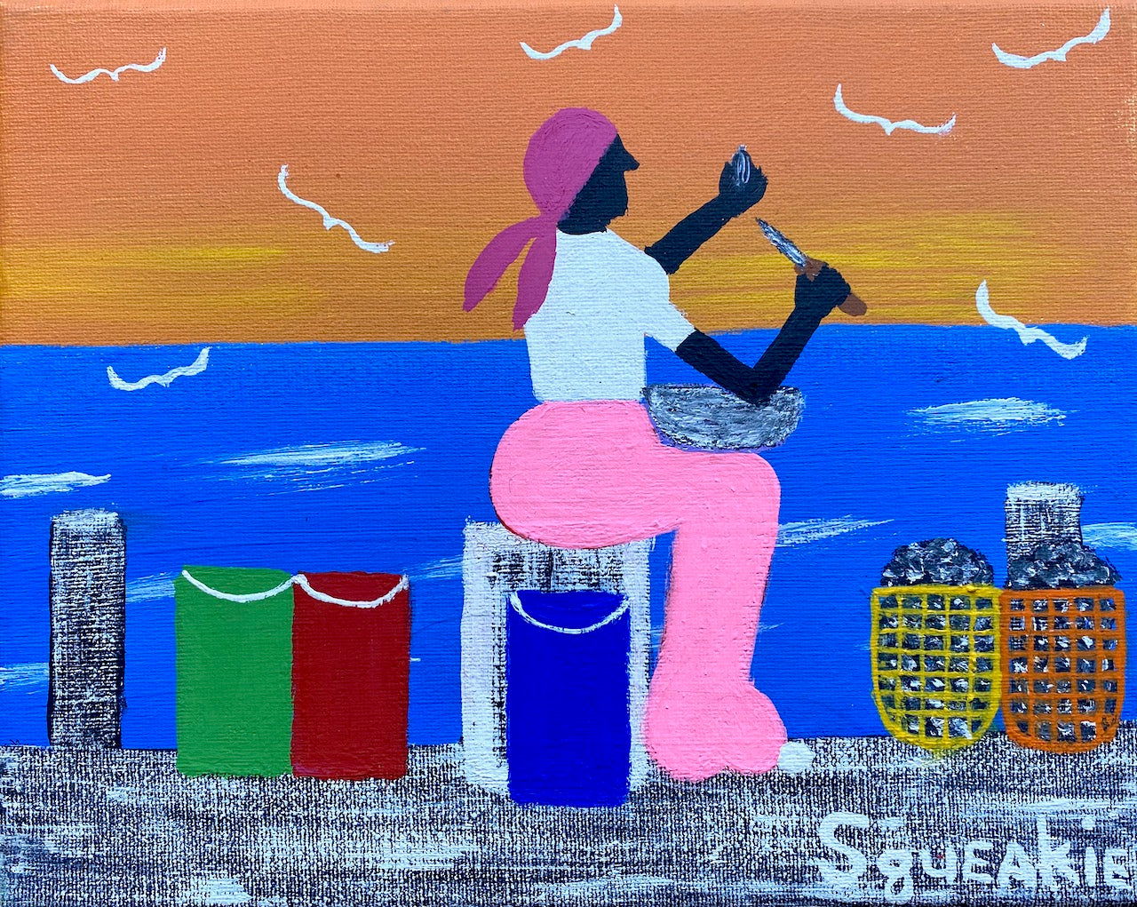 Squeakie is a self-taught artist from the rural Lowcountry whose nostalgic paintings portray a simpler way of life in Coastal South Carolina. He draws his inspiration from memories of childhood where he often worked in tobacco and cotton fields. He talks about this time in his life as "the work was hard, but life was slower, more simple- not so many distractions and bills to pay." He went on to work in factories and grocery stores until he became a house painter for nearly 25 years. Like many self-taught artists, Squeakie did not start creatively painting until later in his life. He was encouraged to do so by his Uncle Henry "Squirrel" Stone, who was a folk artist himself. One of Squirrel's clients asked for a commissioned painting of a church. Squirrel passed this commission on to Squeakie. Since that first painting, Squeakie has a resolute sense of purpose in his work. In 2007 he became a full-time artist, and now his "naive, down-home pictures" have been bought by collectors across the United States, and abroad. He says he paints more now than when he painted houses as his paintings tend to get snapped up quickly.