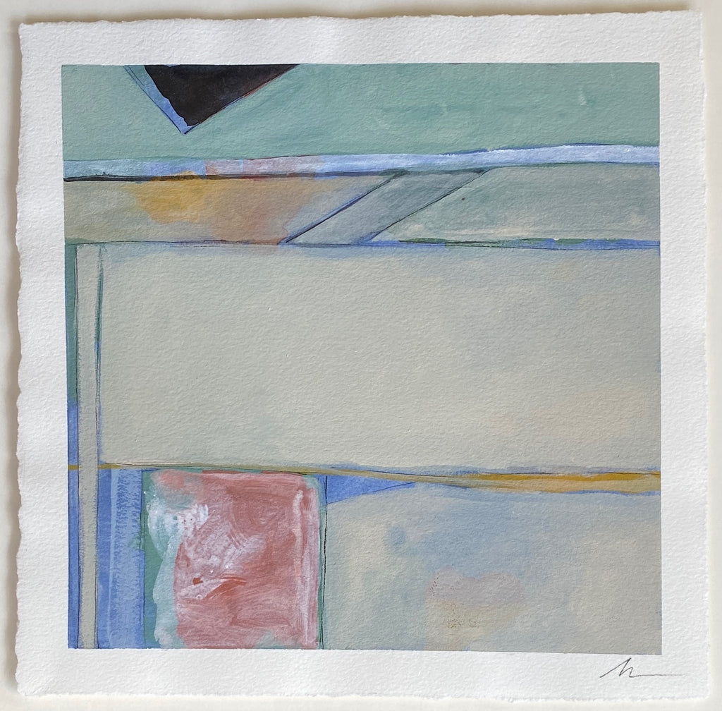 gouache and ink on deckled edge paper, floating on white mat, in maple wood frame